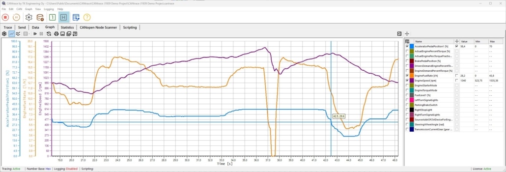 CANtrace features a powerful graphing tool that enables real-time plotting of signal values. You can easily plot multiple signals, switch between single and multi-view presentation modes, adjust the signal presentation, and manipulate the colour-coded signals using user-friendly controls. Utilise data cursors for precise measurements, and export your graphs for reports and documentation.
